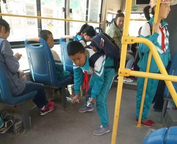 近日,在天祝公交车上,满满一车放学回家的小学生下车后,在公交车内留下一地的垃圾,此时一位小同学默默站起来仔细的拾捡车着车内垃圾,两个小手里攥满了同学们留下的“战利品”,小举动传递了社会文明的正能量。