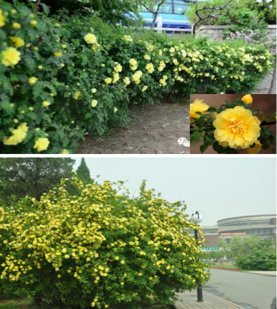 蔷薇科蔷薇属落叶灌木。小枝褐色或褐红色,花重瓣或半重瓣,黄色,无苞片,花直径3-5厘米,花期4-6月,果近球形或倒卵圆形,紫褐色或黑褐色,果期7-8月,喜光,耐寒力强,耐干旱和瘠薄,为优良园林绿化树种,华北、西北各地庭园常见栽培。黄刺玫花色金黄,花期较长,是北方地区主要的早春灌木,多在草坪、路边丛植,开花时金黄一片,光彩耀人,甚为壮观。亦可在高速公路及车行道旁,作花篱种植。