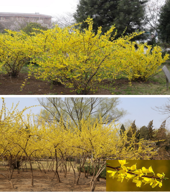 木樨科连翘属落叶灌木。枝干丛生,小枝黄色,叶对生,花期3-4月,花冠黄色,果卵球形,果期7-9月。连翘喜光,也耐荫;喜温暖,湿润气候,也很耐寒;耐干旱瘠薄,在中性或碱性土壤能正常生长。连翘树姿优美、生长旺盛。早春先叶开花,且花期长、花量多,盛开时满枝金黄,芬芳四溢,令人赏心悦目,是早春优良观花灌木,可以做成花篱、花丛、花坛等,在绿化美化城市方面应用广泛,是观光农业和现代园林难得的优良树种。
