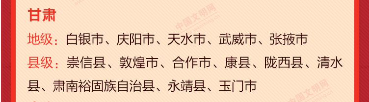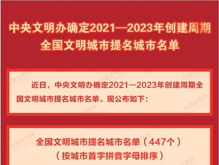 中央文明办公布了20212023年创建周期全国文明城市提名城市名单,全国共有447个城市(区)确定提名,甘肃省5个地级城市、9个县级城市入围,武威市名列其中,成功入围地级名单。