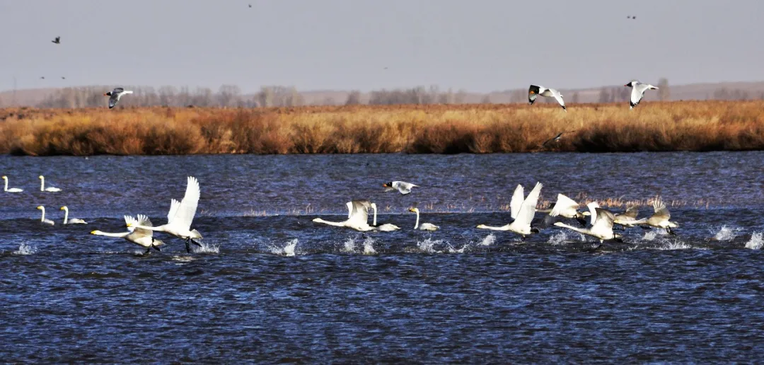 每年冬春季节,在民勤红崖山水库,黑颈鹤、斑头雁、赤麻鸭等野生动物陆续到来,有的在蔚蓝天空中展翅飞舞,有的在清澈的水面逐水嬉戏,每年在红崖山水库越冬的水鸟有80多种2万多只,特别是监测到由日本专家环志放飞的1T46和1T37环志大天鹅已接连6年在红崖山水库越冬,多年未见的国家Ⅰ级保护动物黑鹳、白尾海雕,Ⅱ级保护动物白琵鹭、灰鹤等珍稀鸟类频频出现,给民勤带来了勃勃生机。