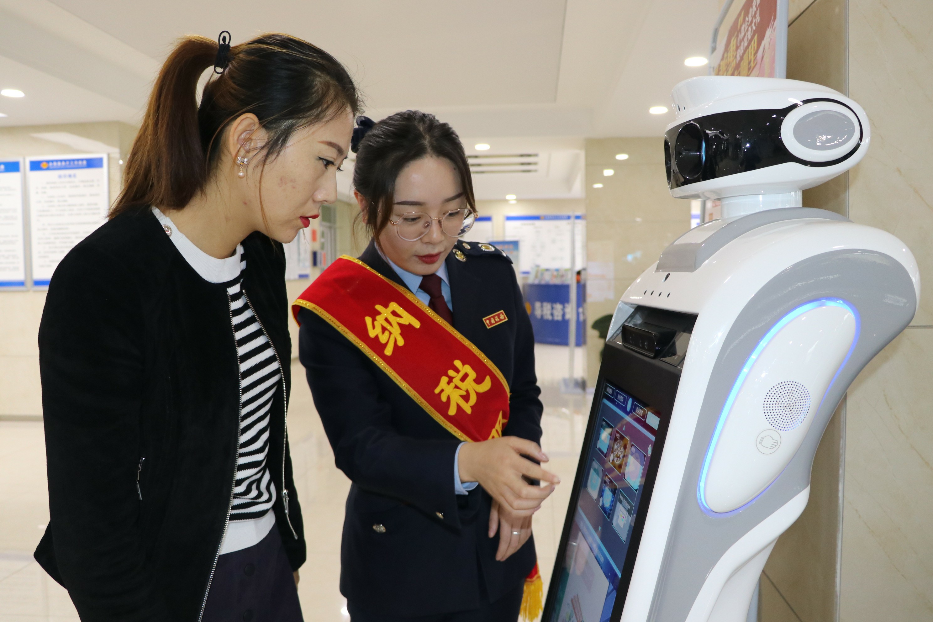 机构改革以来,国家税务总局武威市凉州区税务局深化“互联网+税务”建设,图为税务干部引导纳税人利用智能机器人查询减税降费政策。