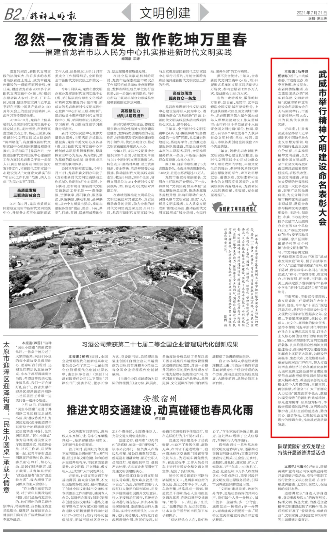 近年来,甘肃省武威市坚持以习近平新时代中国特色社会主义思想为引领,培育和践行社会主义核心价值观,扎实推进精神文明建设,全力创建全国文明城市,全市社会文明程度和市民思想道德素质明显提高。在脱贫攻坚、生态文明建设、新冠肺炎疫情防控等战线涌现出一大批事迹突出、影响广泛的先进典型。为充分展示武威市精神文明建设的丰硕成果,激励全市参与精神文明创建的积极性、主动性、创造性,市委、市政府决定授予武威市人民政府办公室等50个单位(社区)“市级文明单位”称号;授予民勤县东湖镇、凉州区四坝镇寨子村等46个村镇“市级文明村镇”称号。市文明委决定授予褚晓霞家庭等20户家庭“武威市文明家庭”称号,授予许斌等15名个人“武威市道德模范”称号,授予陈斌、段雪燕等45名同志“最美武威人”称号。市委宣传部、市文明办、市教育局、团市委、市妇联、市关工委决定授予曹洪铭等22名中小学生“新时代武威好少年”荣誉称号。