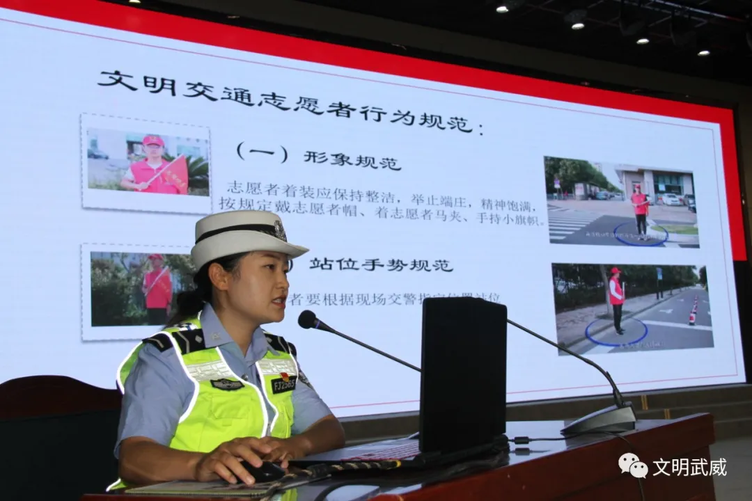 培训会上,武威市公安局凉州分局交警大队民警针对文明交通劝导志愿者的工作内容、着装规范、行为规范、执勤站位、上岗用语等内容就如何开展文明交通劝导志愿服务作了详细的示范讲解。