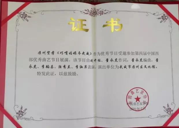 今年7月,在全国人民热烈庆祝中国共产党建党100周年之际,凉州贤孝《巧嘴姑娘夸武威》作为优秀节目受邀参加“牡丹花开心向党”第四届中国西部优秀曲艺节目展演,中国曲艺家协会为《巧嘴姑娘夸武威》颁发了参演证书。