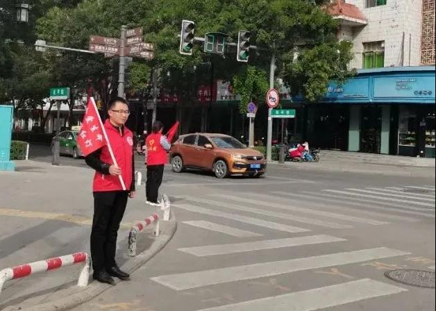 市民宗委志愿者在东小什字开展文明交通劝导志愿服务活动。