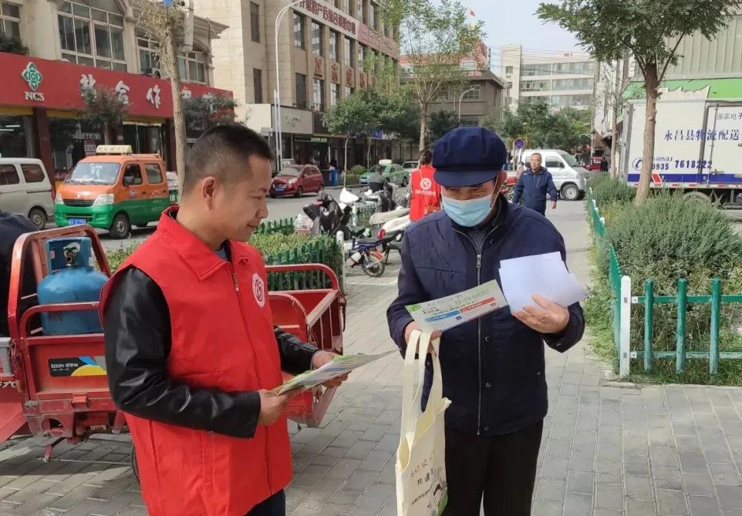 志愿者们,面带微笑,以热心、耐心为居民讲解垃圾分类、网络安全、创城等知识。