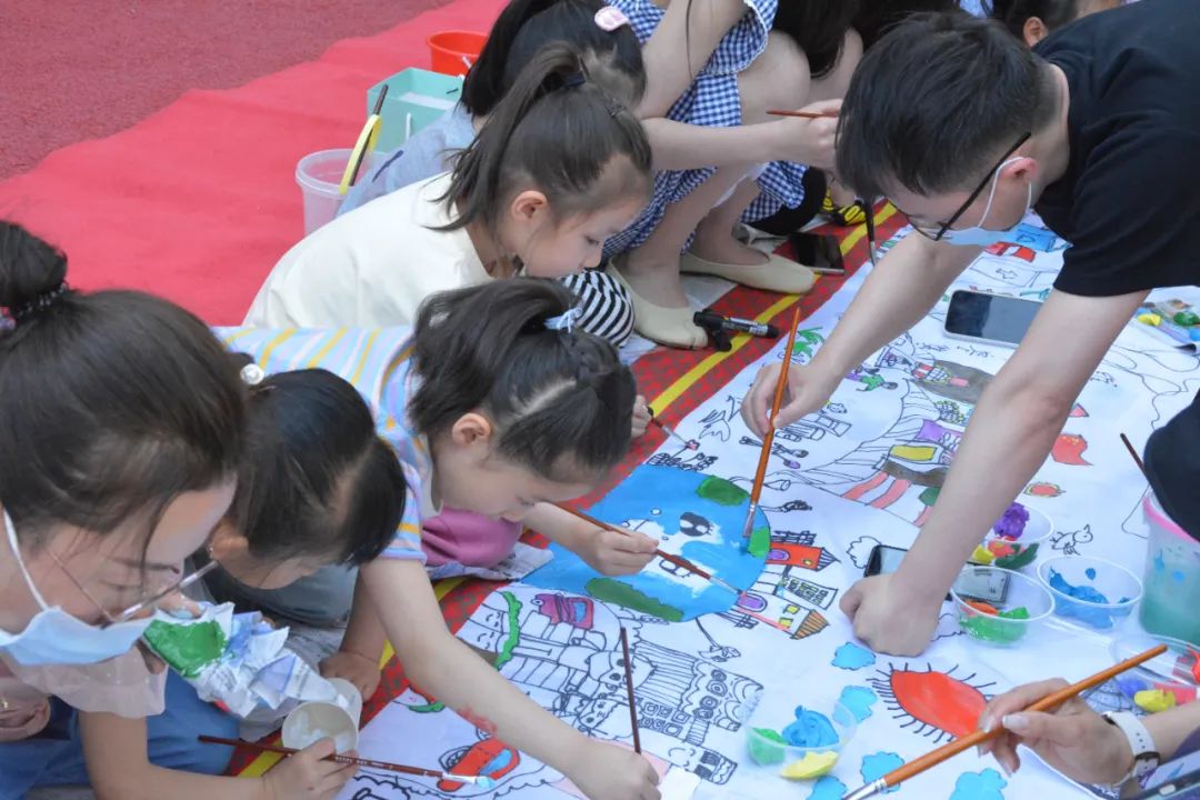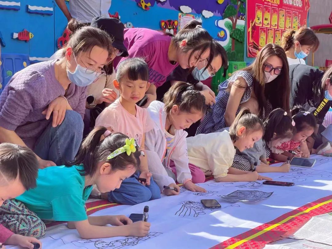 亲子长卷绘画中,孩子们在长卷上尽情地挥笔书画,家长成为了小助手,配合小朋友勾线、调色,一幅幅五彩缤纷的图画油然而生。