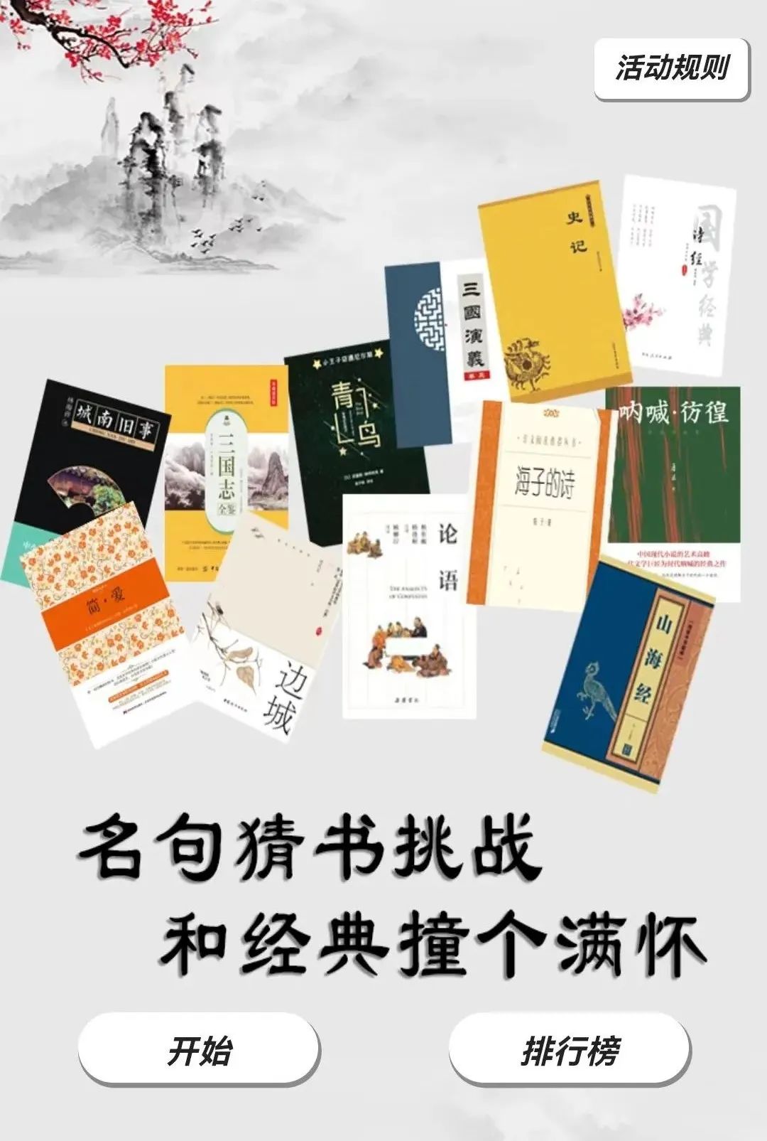 本活动提供100余道题目,通过提供书中名言名句的方式为参与者提供线索,参与者需据此选择相应书籍名称来获得积分。