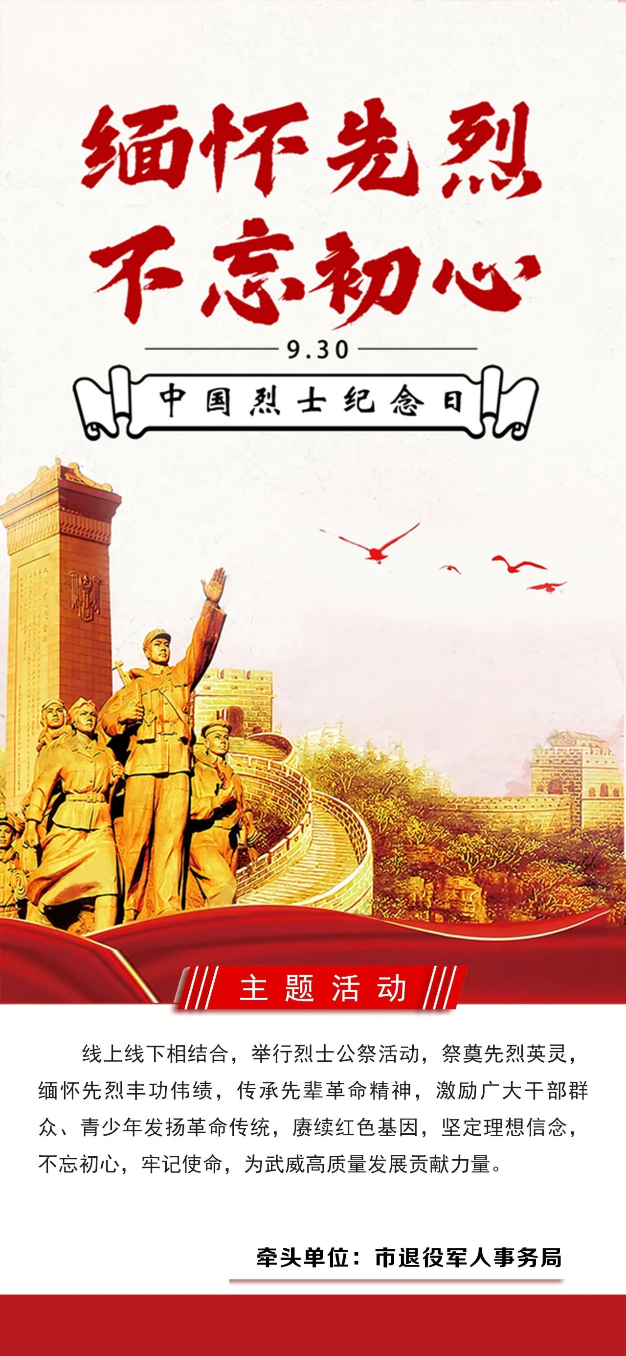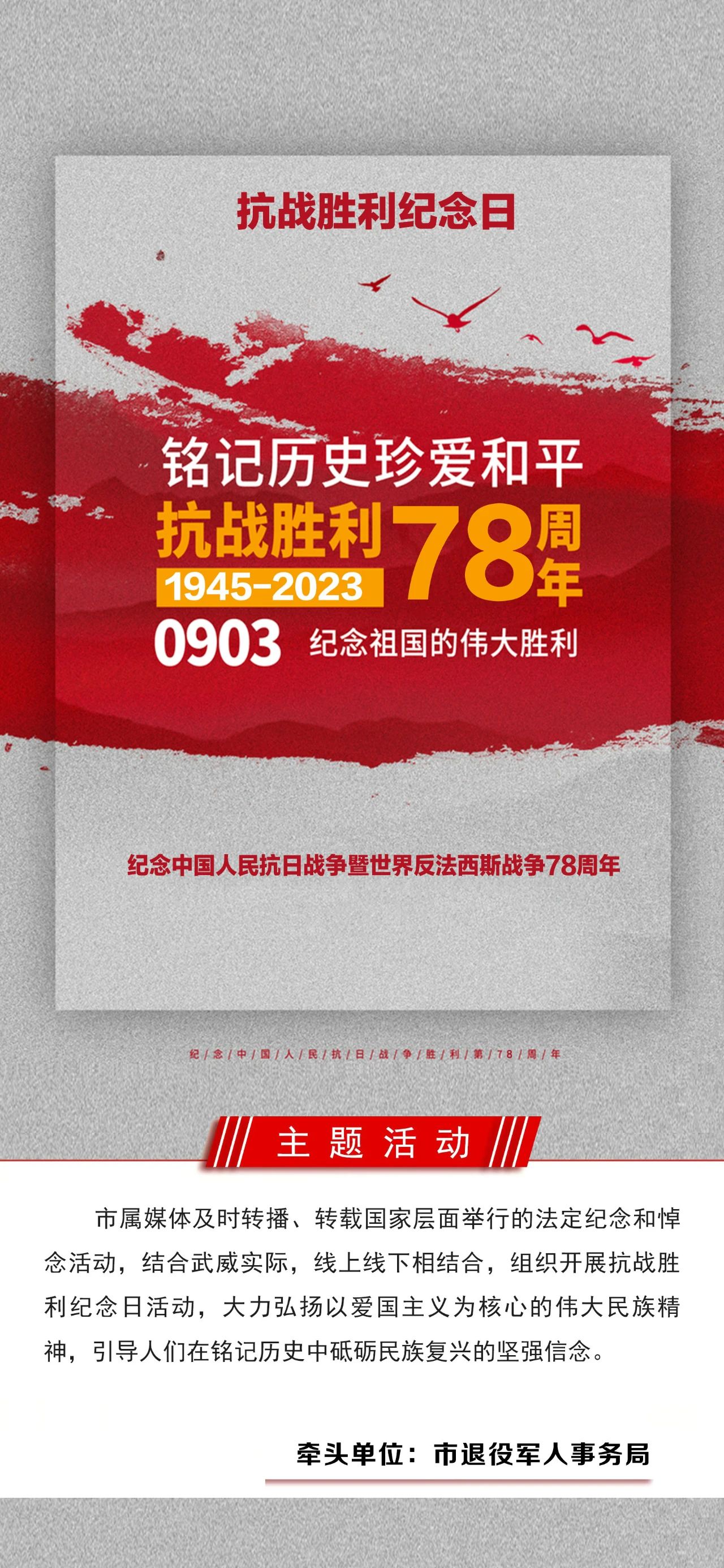 为深入贯彻党的二十大精神,培育和践行社会主义核心价值观,着力提升公民文明素质和社会文明程度,发挥重要传统节日、重大节庆和纪念日等节日涵育功能,武威市开展内涵丰富的系列庆祝、纪念活动和群众性主题宣传教育实践活动,不断增强主题活动的群众性、广泛性和吸引力、感染力。现将9月重大节庆和纪念日群众性主题活动指引发布如下: