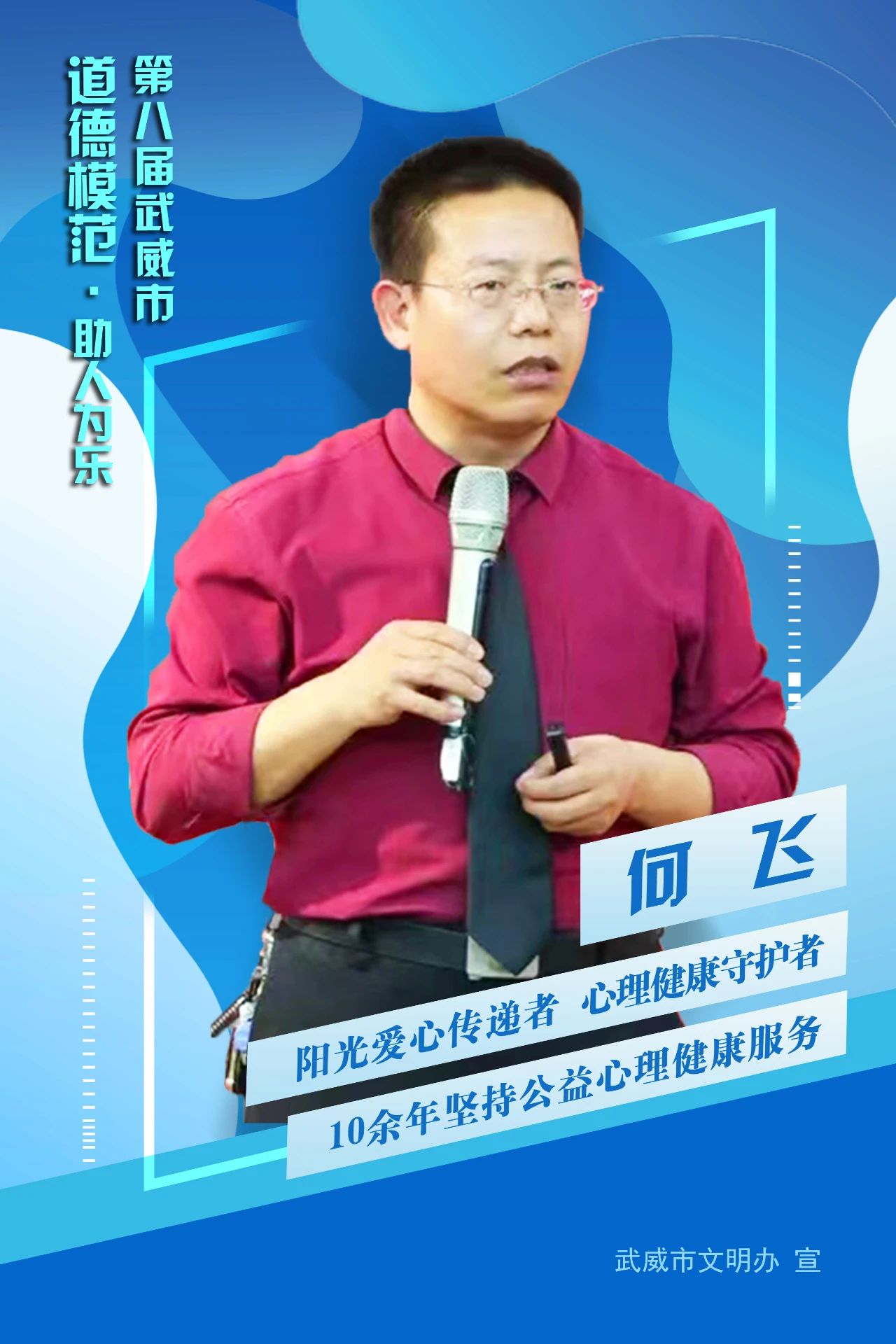 授人玫瑰,手有余香!每当收到这样的称赞时,他只是说:这没什么,我只是觉得,能疗愈一个心灵,就能挽救一个家庭,创建一个平安细胞,就能为稳定一方社会做点贡献,是令人愉快的事情。何飞创办武威市阳光心灵心理咨询中心和武威市心理咨询师协会,源于心、践于行,他用真心抒写真爱,从出发,做心里健康的守护者。10多年来坚持爱心公益活动,足迹遍布省内外的10多个市县(区),累积开展心理健康公益讲座400多场次,受益群众达30多万人次,解决各类心理障碍1000余例。