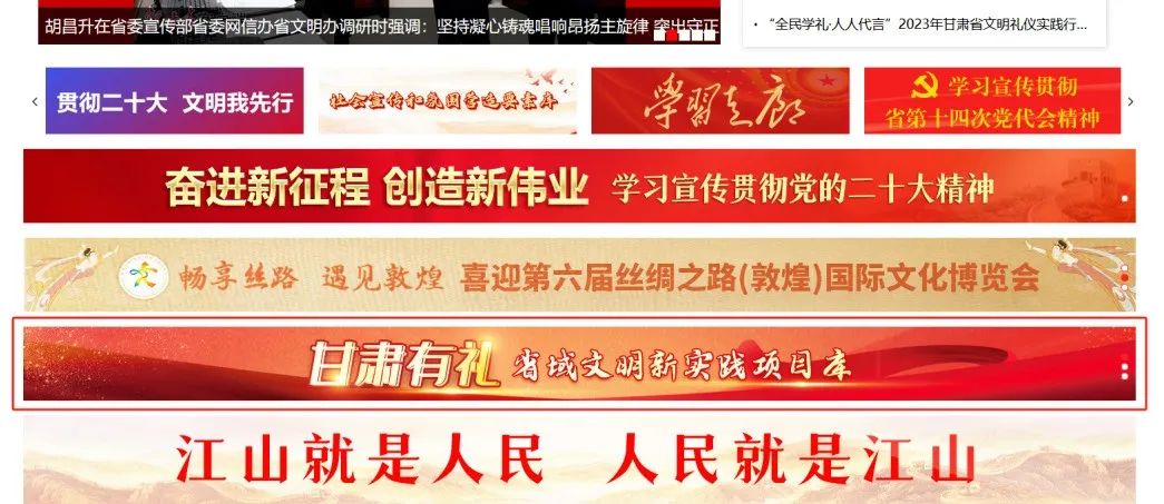 近日,由省文明办设计开发的“甘肃有礼”省域文明新实践项目库在“甘肃文明网”正式上线运行(网址http://www.godppgs.gov.cn/cms_udf/2023/111060952/index.shtml)。项目库以“文字简介+项目视频”的方式,集中展示各地各部门在有礼交通、有礼景区、有礼餐桌、有礼上网、有礼观赛(展)、有礼言行等方面的文明礼仪特色品牌。