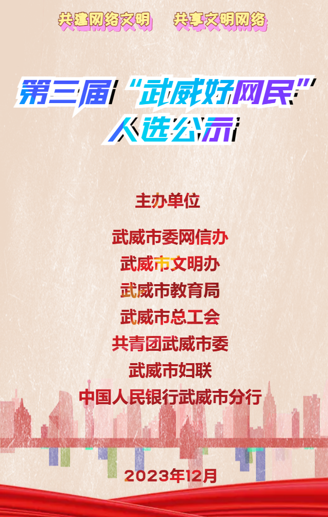 为深入贯彻落实习近平总书记关于培育中国好网民的重要指示精神,加快推进网络文明建设,市委网信办联合市文明办、市教育局、市总工会、团市委、市妇联、中国人民银行武威市分行开展了第三届“武威好网民”评选活动。经广泛宣传、层层发动、自荐推荐、筛选评审并征求相关部门意见,拟确定张论文等15名同志为“武威好网民”人选,现予公示,欢迎社会各界监督。