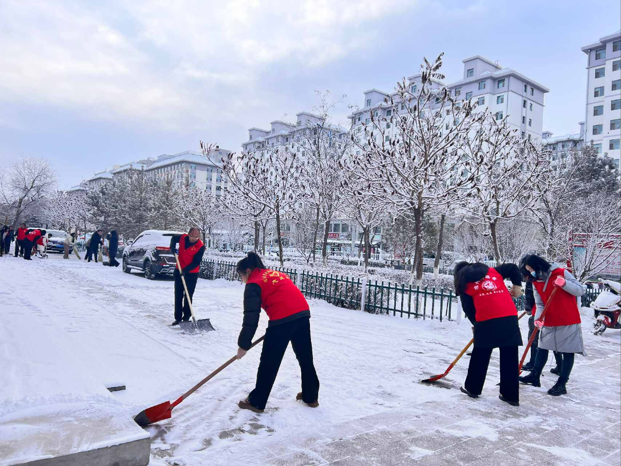 在志愿者们的齐心协力、密切配合下,路面积雪结冰被有效清除,被积雪覆盖的道路恢复了原貌,美丽的"志愿红"与皑皑雪景一道,交相编织了一道最暖心的风景线。