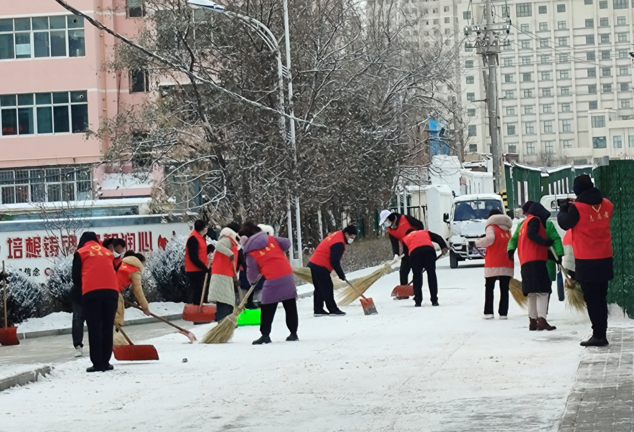 市区机关干部、志愿者手拿扫帚、铁锹等工具,干劲十足,相互配合,认真清扫道路积雪,铲除路面积冰。