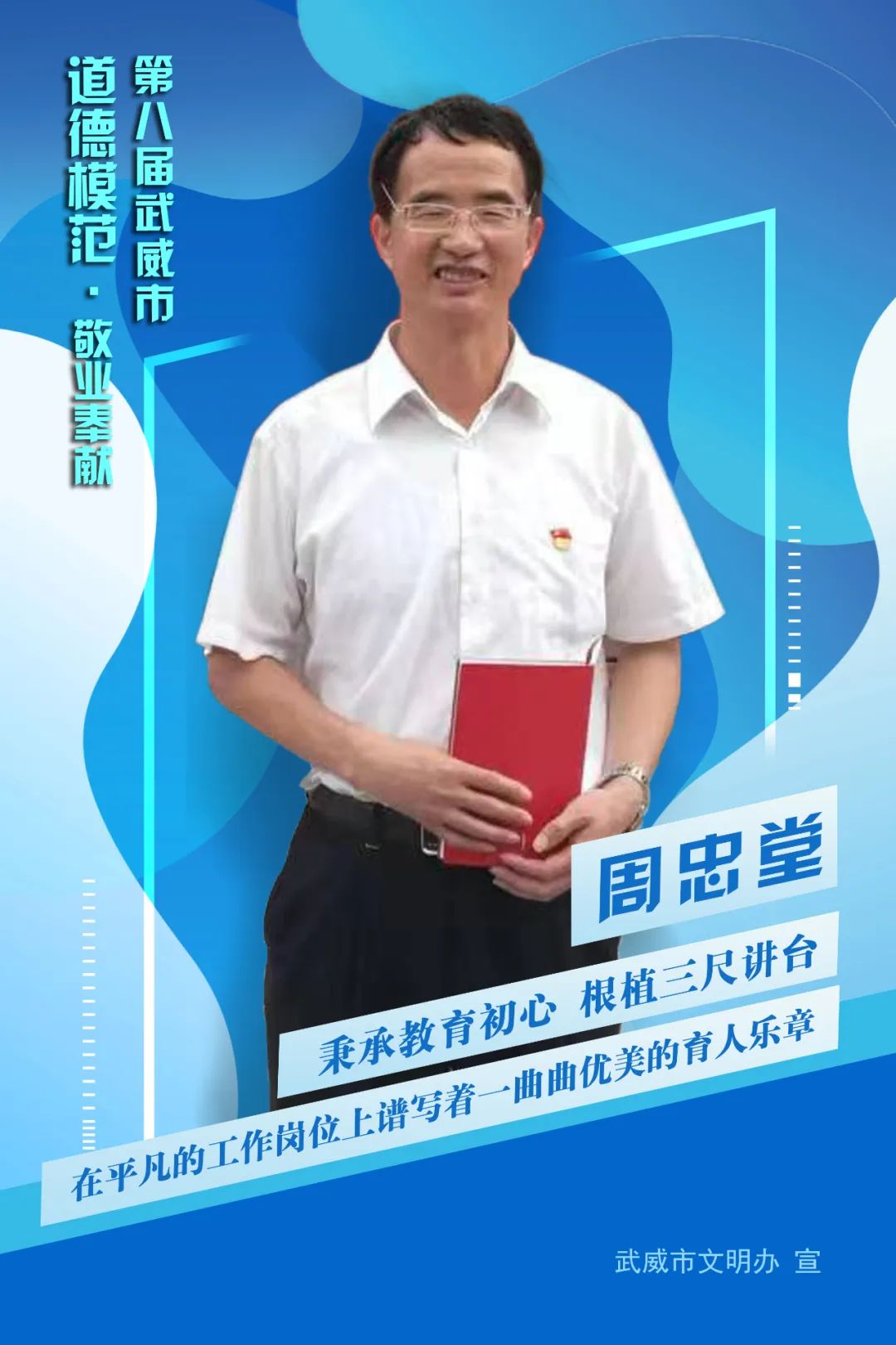 周忠堂始终秉承“捧着一颗心来,不带半根草去”的教育初心,把爱的阳光洒向他钟爱的教育事业,用爱的真心帮学生扣好人生的第一粒扣子。坚定信念,笃守初心,大学毕业的周忠堂怀揣理想与信念,成为了一名教师,根植于百年名校武威一中的三尺讲台,教书育人,在平凡的工作岗位上谱写着一曲曲优美的育人乐章。他注重细节,精心教学,对教学内容有效整合、反复打磨、精心取舍、挤去水分、榨取“干货”,把精品课讲授给学生。成功创建了“四步一体”课堂教学模式。桃李不言,下自成蹊,他一直坚守着“其身正,不令而行;其身不正,虽令不从”的教育信条,用爱呵护着每一位学生的成长。矢志不渝,初心不改,近年来,周老师在与糖尿病+甲状腺癌不断抗争的同时,仍坚持在教学一线。三尺讲台勤耕耘,只为桃李竞相开,教育让他付出了许多,同时也真正收获到做老师的艰辛与快乐。
