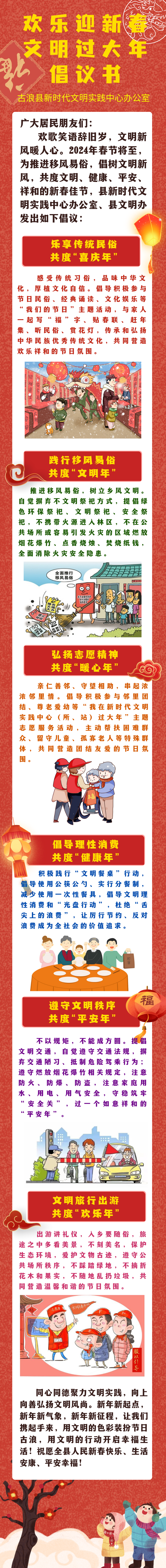 欢歌笑语辞旧岁,文明新风暖人心。2024年春节将至,为推进移风易俗,倡树文明新风,共度文明、健康、平安、祥和、友爱的新春佳节,县新时代文明实践中心办公室、县文明办向广大居民朋友发出如下倡议: