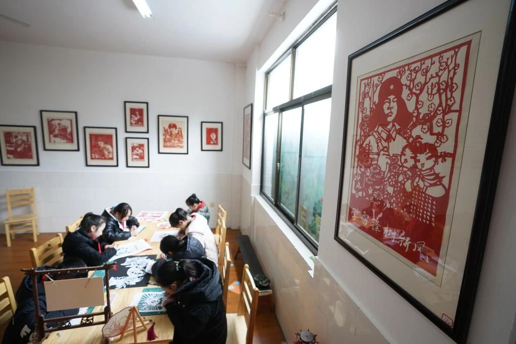 2023年2月24日,江苏南通金沙小学的学生在创作雷锋主题的剪纸作品。新华社记者 季春鹏 摄
