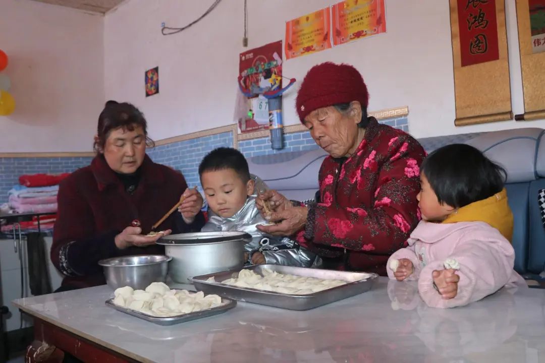 “我的小心疼子,快下炕来玩,待会儿奶奶给你们煮饺子吃!”56岁的朱金梅熟练地包着饺子,一折一捏,一个完美的饺子就诞生了。