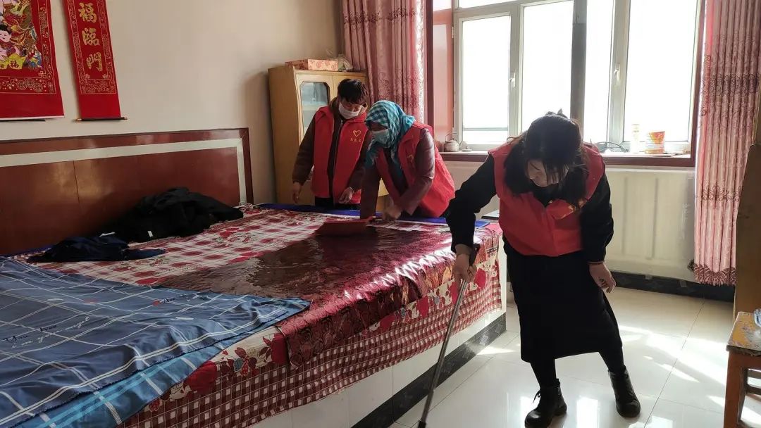李福桂(右一)在留守老人家里打扫卫生