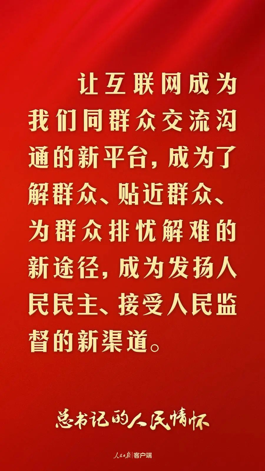 “各级党政机关和领导干部要提高通过互联网组织群众、宣传群众、引导群众、服务群众的本领”“让互联网成为我们同群众交流沟通的新平台,成为了解群众、贴近群众、为群众排忧解难的新途径,成为发扬人民民主、接受人民监督的新渠道”……