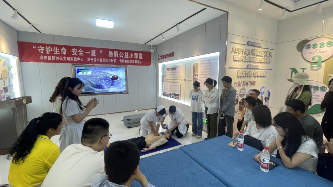 近日,凉州区新时代文明实践中心会同凉州区中西医结合医院,共同举办“守护生命,安全一夏”暑假公益小课堂文明实践活动,通过专业的紧急抢救和防溺水知识宣传,加强青少年和老年人群体的安全意识,提升群众的自救互救能力。