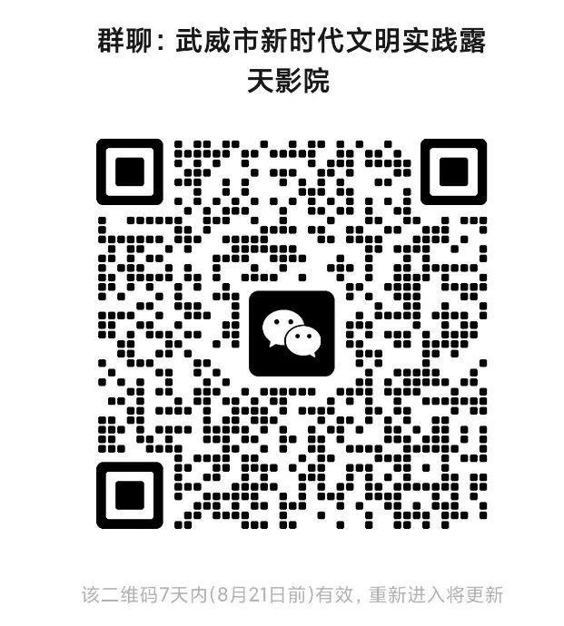 有意向参加的群众请微信扫描下方二维码加入“武威市新时代文明实践露天影院”,发送基本信息,经工作人员审核开展集中培训后,即可参加活动。(联系方式:18109358399,代书记)