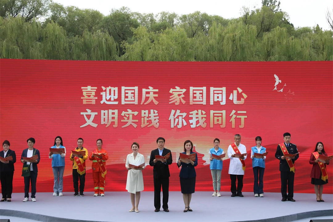 活动现场,文明实践志愿者发出倡议,号召全社会弘扬爱国主义精神、互助共创美好生活、培育时代文明新风,人人争做文明实践行动者。快板书《天安门广场看升旗》、歌曲《我爱你中国》、诵读《英雄》等节目,表达了对伟大祖国的真挚热爱和美好祝福,赢得现场阵阵掌声。