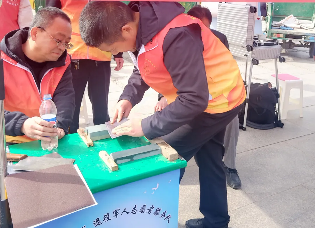 ▲古钟楼社区联合和颜悦色美发开展义剪和社区退役军人志愿服务队免费“磨剪刀、磨菜刀”文明实践活动。