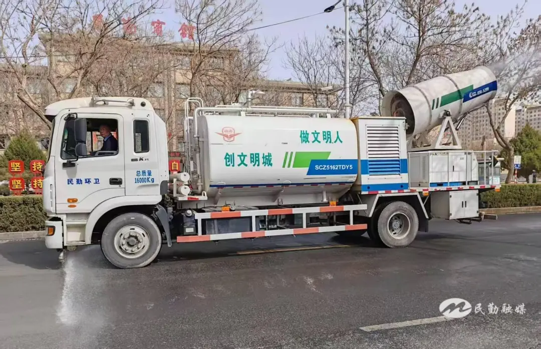 民勤县城市环境卫生服务所副所长马志龙介绍,“沙尘天气结束后,环卫所全面启动机械湿扫作业,采用‘加大频次,错峰保洁’的工作方法,快速组织人工和机械全员出动,统筹调配洗扫车、洒水车和抑尘车等带水作业车辆,对城区主次干道实施精准作业,最大程度减少道路扬尘,全面提升道路洁净度,改善空气质量 。”